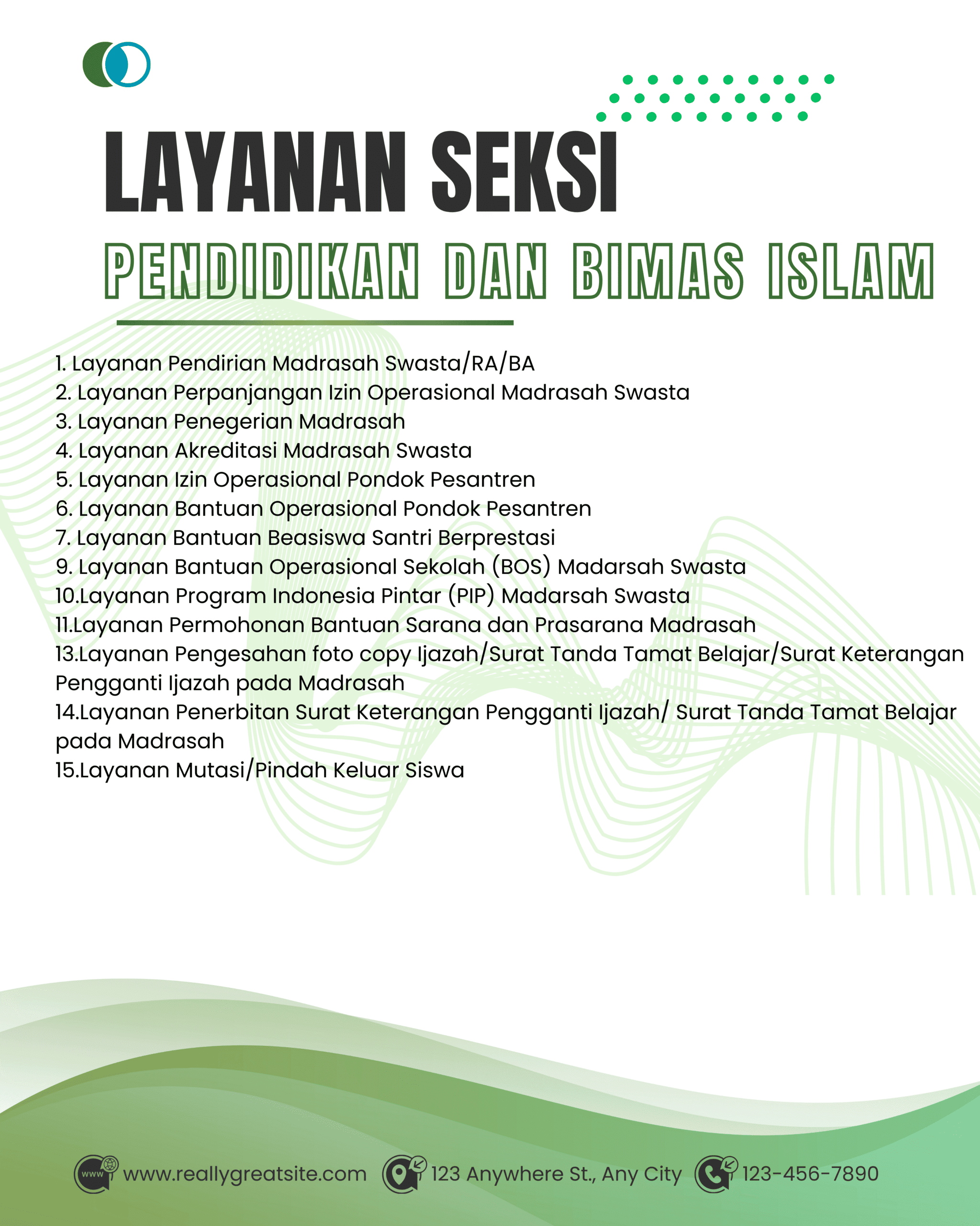 Seksi ini menangani seluruh urusan yang berkaitan dengan pendidikan keagamaan Islam dan pembinaan umat Islam.